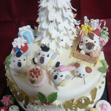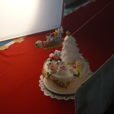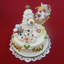 Wao!のデザイナーさんがこういう感じでとデザインしたものを私が作成しました。デザイナーさんはシュガークラフトの事を知っていてという状態ではないので、ケーキの上にクリスマスツリーと、Wao!のキャラをという感じで、技法とかの指定はなく、細かいところは私が考えました。でも白いケーキに白いツリーと色は指定。もし私が作るなら、ツリーは緑色にするので作っていても違和感があって、緑じゃダメですか?なんて聞いてみたけど白でとのことで。私の作品だけど、なんか違うようないい経験になりました。