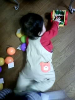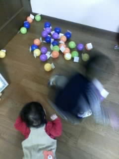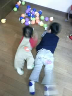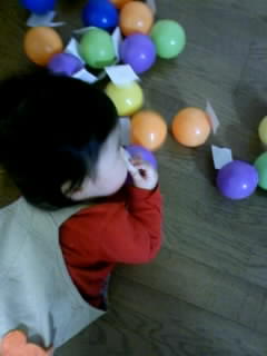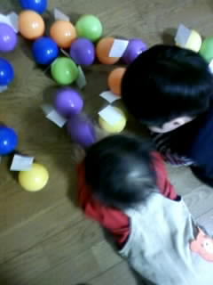 | みくちゃんはなかなかボールがつかめず、れっくんがアシスト中。そのうち紙だけ取ってお口に・・。 |