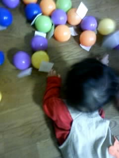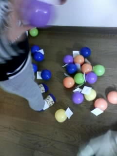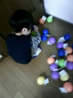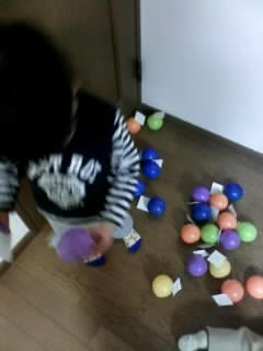 | またまたボールに名前と希望商品を書いたものをぺたぺた。前回使ったボールプールは穴あいてすごく前に処分。↑↑ |