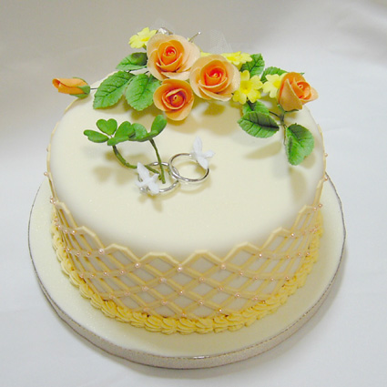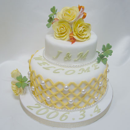 薄い黄色のケーキに、オレンジ色のバラや、クローバーで飾りました。明るい雰囲気でとっても素敵です。制作時間は11時間程度です。
