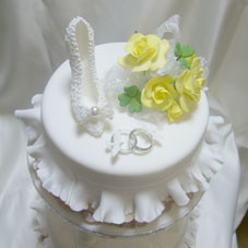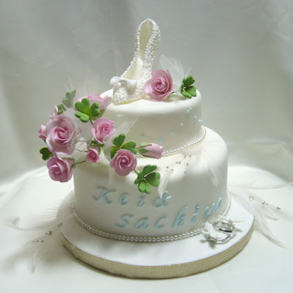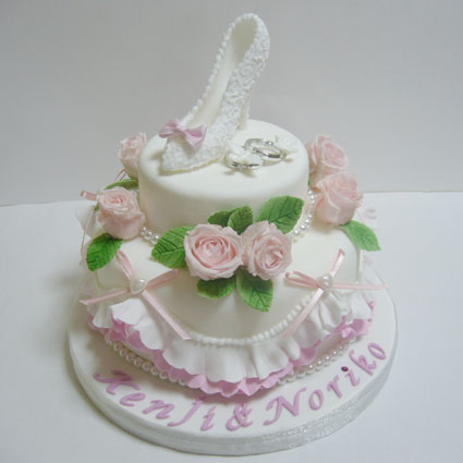 真っ白のケーキに、青いバラのとっても上品なケーキです。トップにはハイヒールとリングを飾りました。初めてだったので、最初はどうなることやらと思ったそうですが、完成品にはとても感激していただけました。