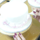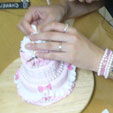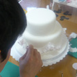 お友達へのプレゼントに3段のミニケーキを作られました。カバーリングだけ私の方で事前に準備しましたが、4時間ほどで完成しました。