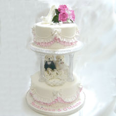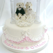 とてもラブリーなウエディングケーキです。アートフラワーのお花はTさん作成、ビーズのティアラはSWEETPRINCESS、フリルについているビーズはTさんのお友達担当、テディベアも乗ったコラボ作品です。彼の転勤の都合で、早くから制作を初めていたので、挙式の半年前には完成していました。両親贈呈用のけーキも作られました。 |