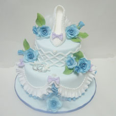 既婚者の方ですが、ウエディングケーキを作られました。ブルーのバラと白いハイヒールがとても素敵です。