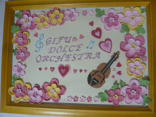所属されているオーケストラのコンサート時に受付に飾られました。制作時間は2時間半くらいで、パーツだけ作ってあとはご自宅で飾り付け。サイズはA4より少し大きいくらいです。バイオリンもクッキー型で抜いたシュガークラフト、とても華やかでかわいらしい雰囲気です。