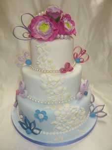 いろいろな本や写真を参考にして、色やデザインにこだわった作品です。海が好きなお二人とのことで、青のグラデーションのケーキです。トップのお花は色合いもとてもきれいで豪華に仕上がってます。 |