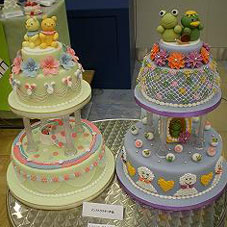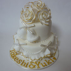 | 3台同じ大きさ、トップに人形、その下に絞りのお花を乗せる同じスタイルで作成しました。ウィルトンはシュガーの型が使えなかったり、ペーストを使った技法にかなり制限があるので、最初は大変だったけどそのおかげで、絞りをかなり取り入れた作品を作ることができ、自分の勉強にもなりました。 |