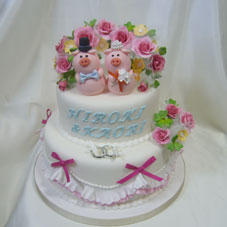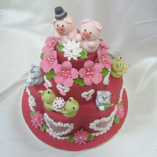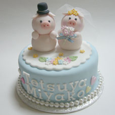 友達がウエディングケーキの上に、シュガーの人形を乗せたいということで、二人で作りました。しゃべってばかりで、なかなか進みませんでしたが、彼女らしくもあり、私らしくもあるブタちゃんができて、楽しかったです。 |