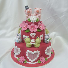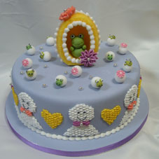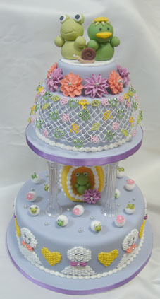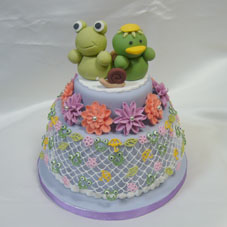 カエルの家はグラニュー糖でできていて、側面のてるてる坊主やハートは、バスケット絞りでできています。 |